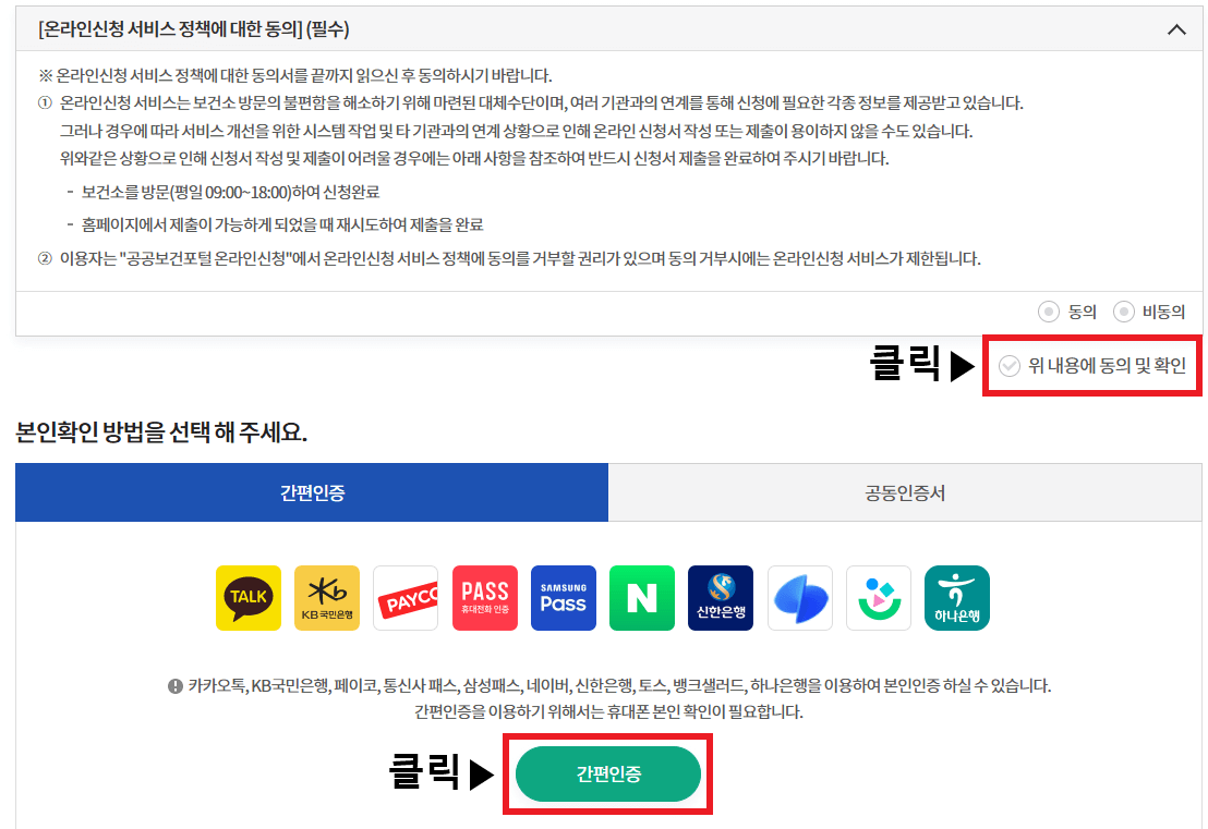 3. '위 내용에 동의 및 확인' 클릭 및 간편 인증, 공동인증서 로그인