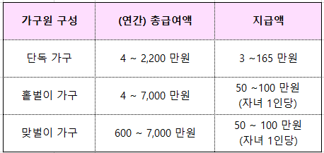 - 동일주소지에 거주하는 중증장애인(연령제한 X) & 연간소득액 100만 원 이하
