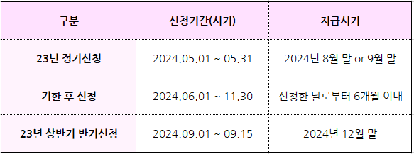 정기신청 대상자의 경우 기한 내 신청하지 않으면 기한 후 신청으로만 신청이 가능하며, 기한 후 신청 시 지급 금액의 5%가 감액되니 신청기간 잘 확인하셔서 손해보는 일 없으셨으면 좋겠습니다.