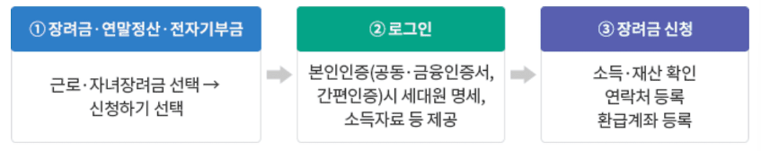 홈택스 홈페이지 로그인 → 장려금ㆍ연말정산 ㆍ전자기부금 → 근로 ㆍ자녀장려금 정기신청 → 신청하기