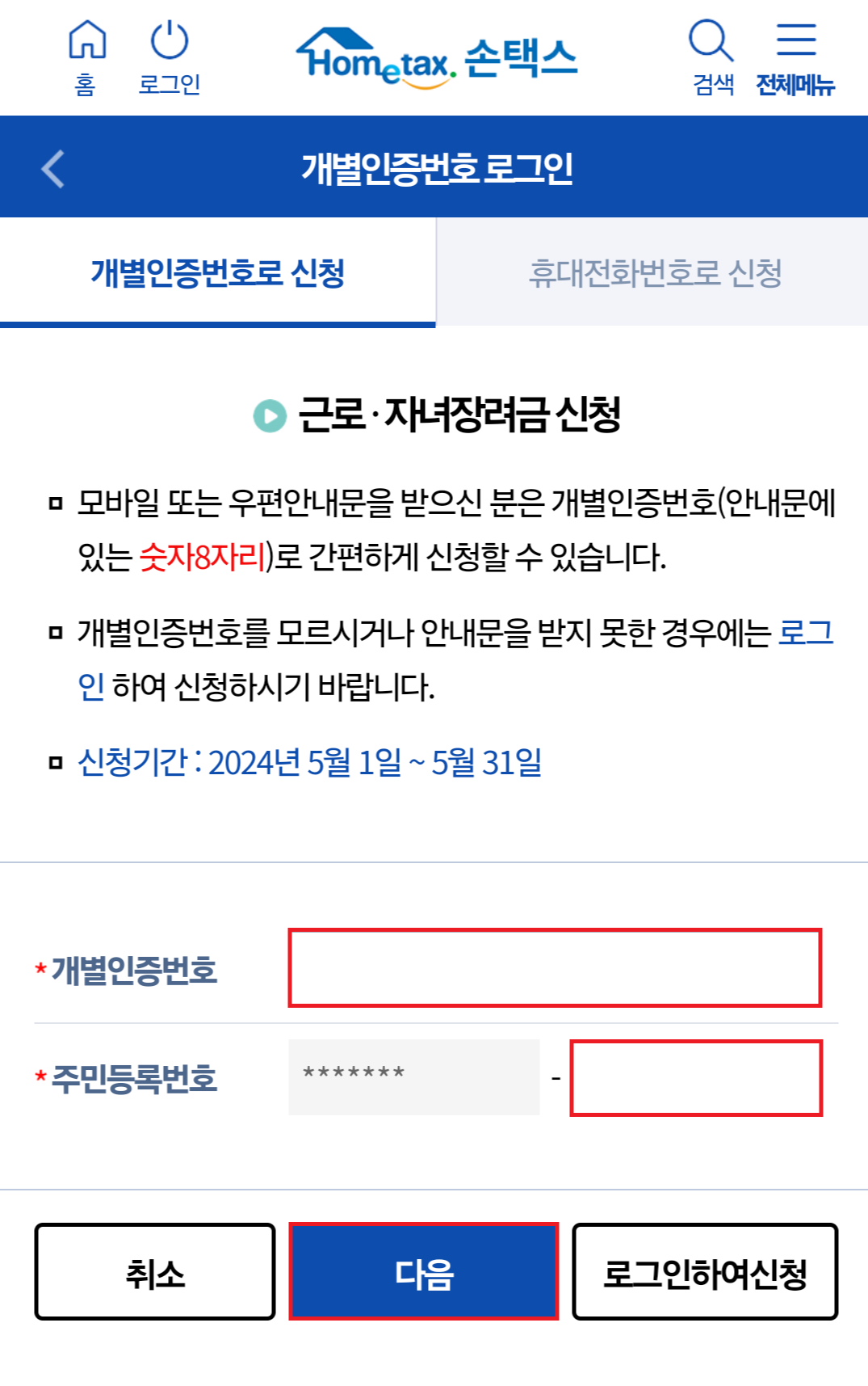 2) 개별인증번호로 신청 → 개별인증번호, 주민등록번호 뒤 7자리 입력 → 다음 클릭 → 신청하기