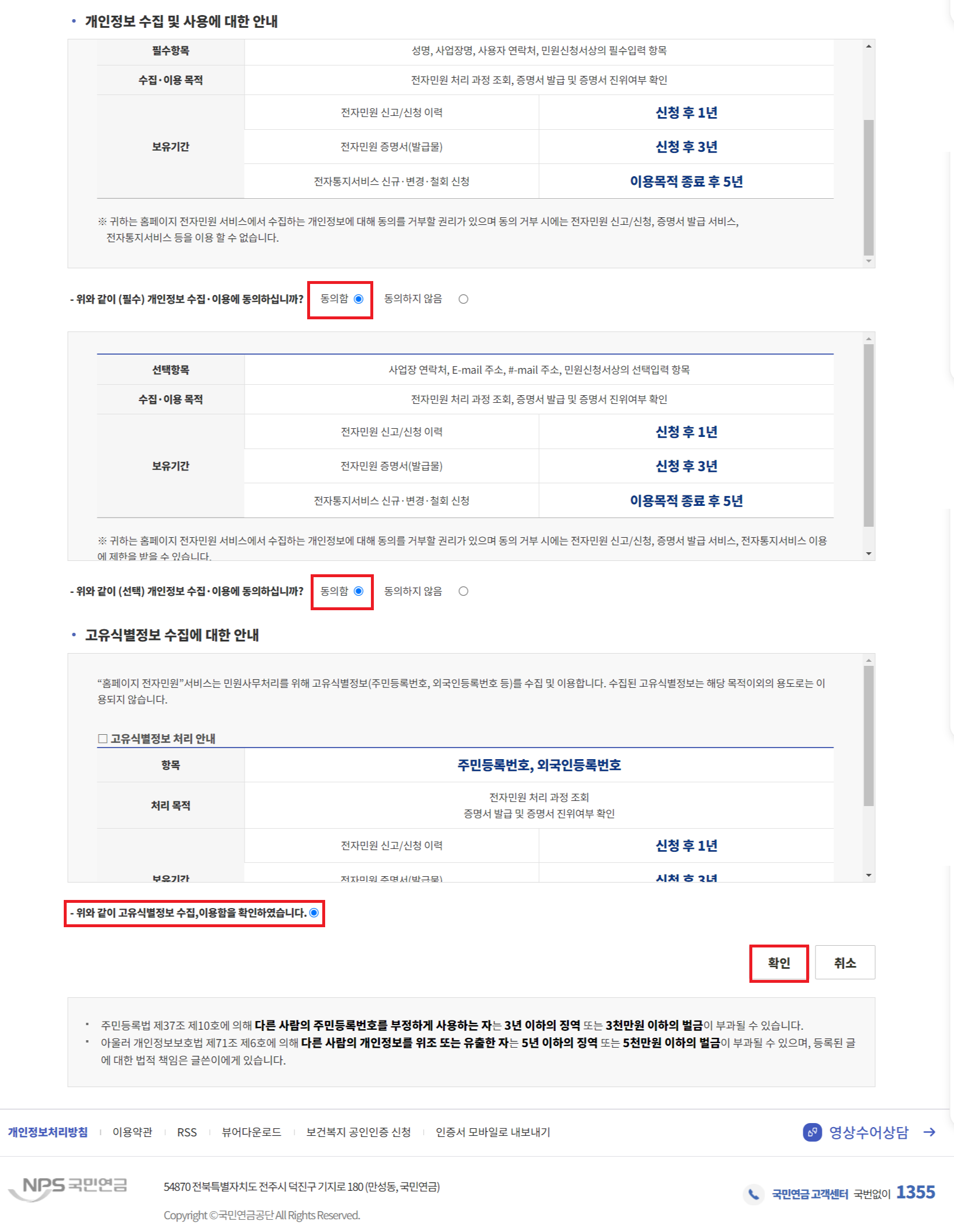⑤ 개인정보수집, 고유식별정보 수집 동의함 체크 → "확인" 클릭