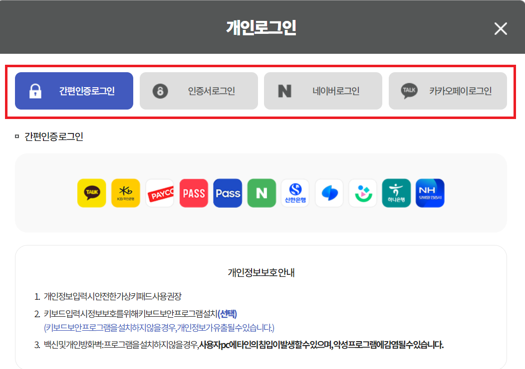 ② 개인 로그인 → 간편 인증, 인증서, 네이버, 카카오페이 中 택 1 → 로그인