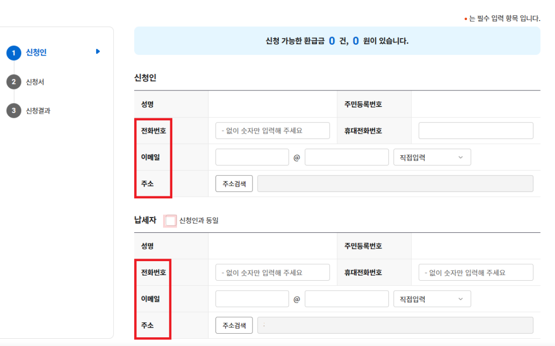 3. '신청인' 정보 입력 → 신청자와 납세자가 동일한 경우 '신청인과 동일' 좌측 체크박스에 체크 → 납세자 정보 입력