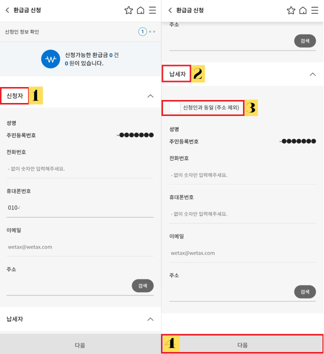 3. 신청자 및 납세자 정보 입력 → 신청자와 잡세자가 동일한 경우 '신청인과 동일' 옆 체크박스 체크 → 4번 다음버튼 클릭