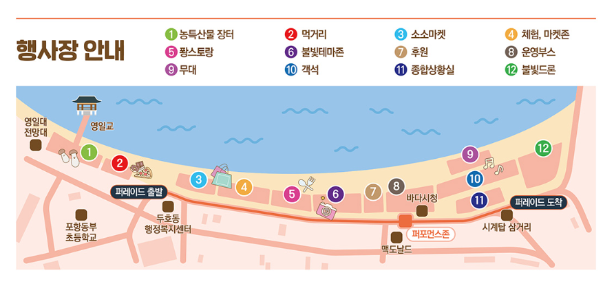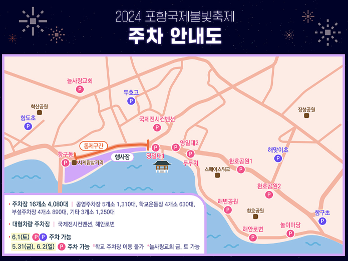 축제기간 3일 동안 두호동 행정복지센터부터 영일대 시계탑 삼거리까지 해안도로 차량 이동이 통제되오니 차를 가지고 오시는 분들은 해당 사항 참고하시면 좋을 것 같습니다.